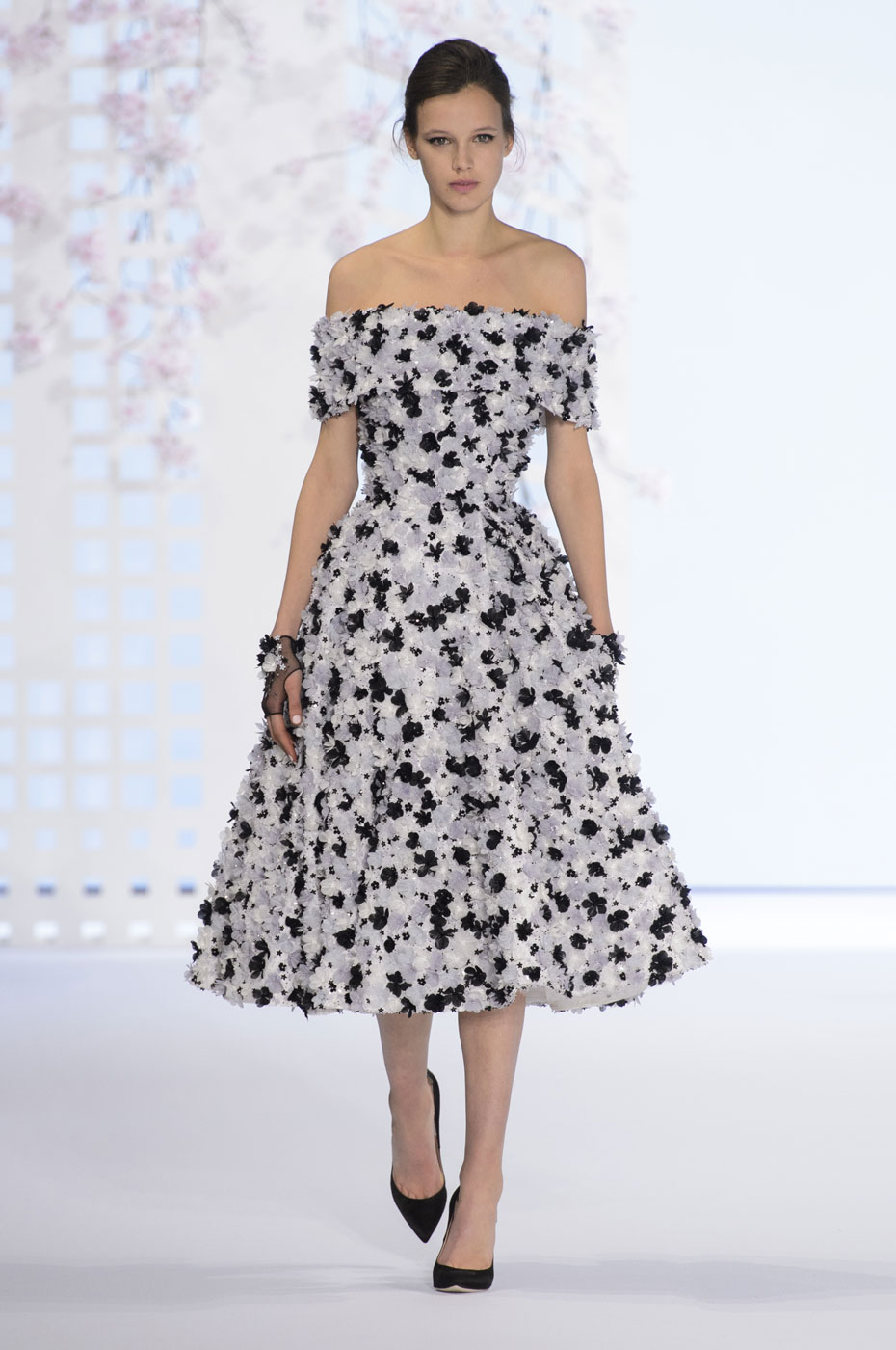 Le ampie gonne degli abiti da sera sembrano volare grazie alla loro perfetta costruzione. La palette dei colori scelti vede predominare il bianco, sempre chic d'estate, oltre al rosa cipria, albicocca, glicine, oro e, per la sera più glamour, tanto nero, sia da solo che in contrasto cromatico con il bianco in stampe fantasia e applicazioni.